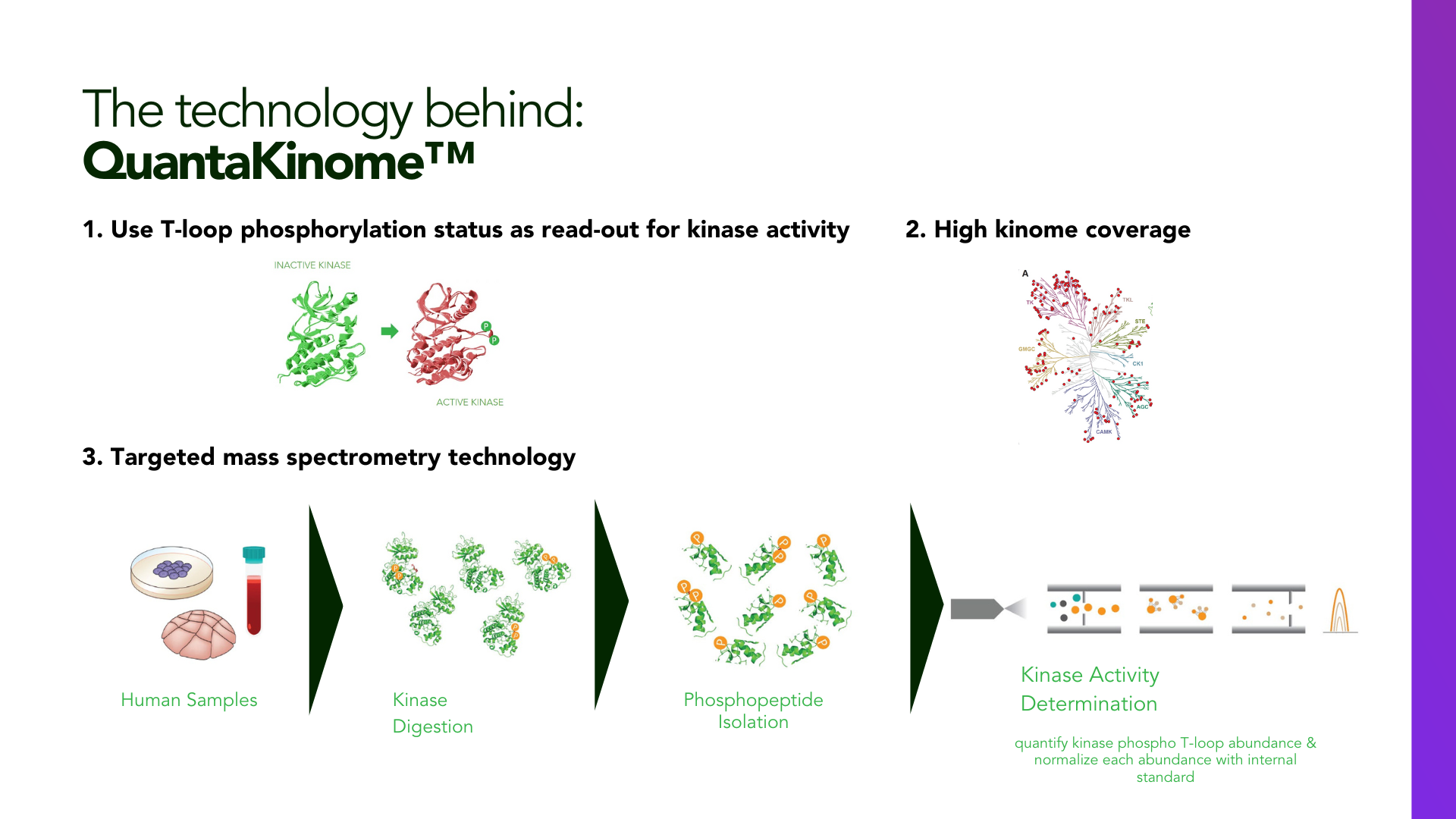 QuantaKinome™ is a targeted mass spectrometry-based phosphoproteomics technology. This is a highly specific and sensitive technique which selectively quantifies phosphorylated activation loops of protein kinases within complex human samples.